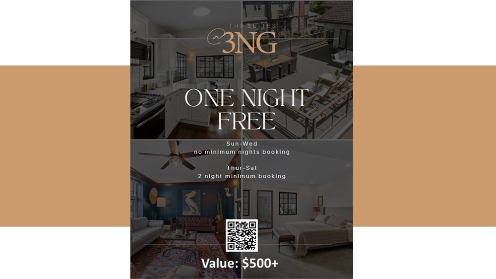 One Free Night at the Suites at 3NG! Value: $500+ Looking for the perfect space for a special day or getaway? Experience urban luxury at The Suites @ 3NG. Occupying the second and third floors of a beautifully restored 1920s mansion, this meticulously renovated space offers 3,378 square feet of contemporary elegance. Sun - Wed: No minimum nights booking Thur - Sat: 2 night minimum booking