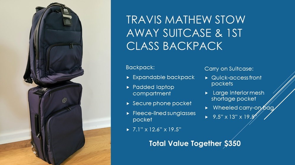 Backpack: Expandable backpack Padded laptop compartment Secure phone pocket Fleece-lined sunglasses pocket 7.1” x 12.6” x 19.5” Carry on Suitcase: Quick-access front pockets Large interior mesh shortage pocket Wheeled carry-on bag 9.5” x 13” x 19.5”
