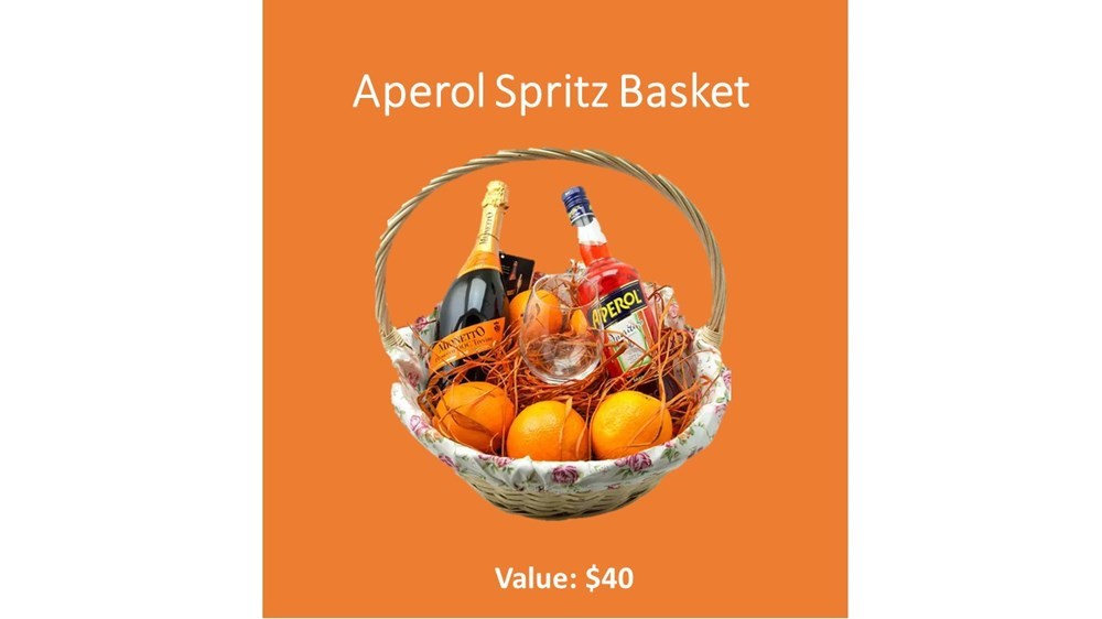 Aperol Spritz Basket Includes: -1 Bottle of Aperol -1 Bottle of Prosecco -Club Soda -Orange -Plate