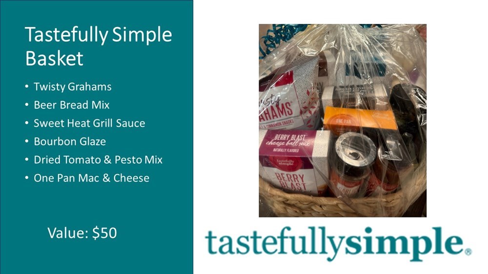 Tastefully Simple Basket Includes: -Twisty Grahams -Beer Bread Mix -Sweet Heat Grill Sauce -Bourbon Glaze -Dried Tomato & Pesto Mix -One Pan Mac & Cheese